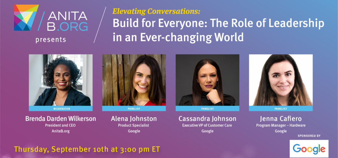 Brenda Darden Wilkerson, President & CEO at AnitaB.org, led an inspiring and candid conversation on “Build for Everyone: The Role of Leadership in an Ever-changing World,” with experts from Google to discuss how leadership is a tool that everyone can continue to build for themselves and others.